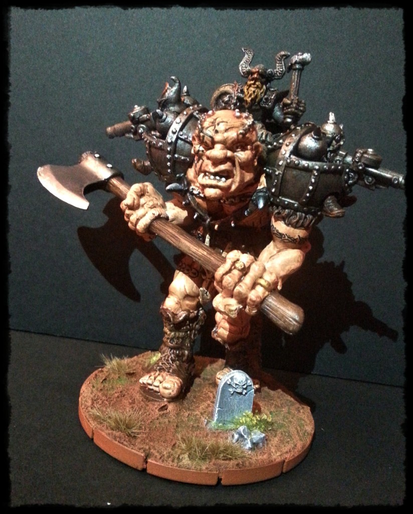 El gigante se trata de una antigua miniatura prepintada de Mage Knight la cual ha pasado por mi taller de "chapa y pintura", para ser un modelo terminado no estaba nada mal, he tenido que retocar un poco la piel con tinta marrón y luces posteriores así como darle una manita a todo el metal que lleva en sus espaldas.
